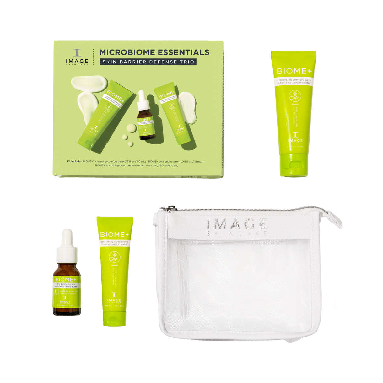 Discover BIOME+, our microbiome-friendly skincare collection that is formulated to respect and reinforce the skin barrier. This three-step routine features a nourishing cleansing balm, dewy-skin serum and cloud-like moisture crème, all formulated with plant-based squalane to nurture, comfort and brighten skin. The travel-friendly sizes come in a transparent cosmetic bag for healthy, glowing skin at home or away.